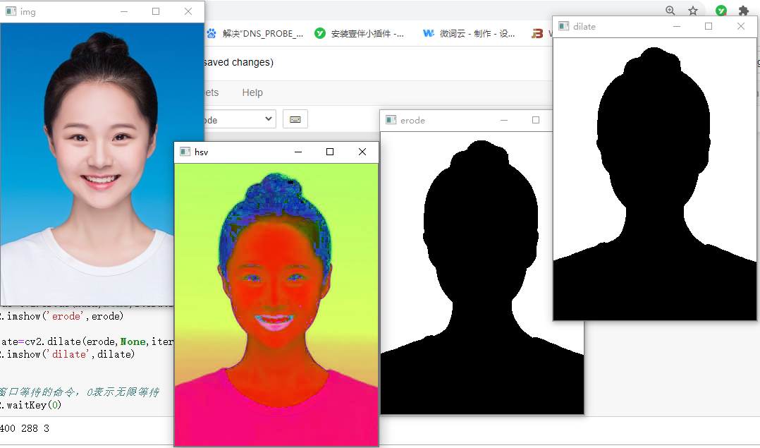 上面的图象进行二值化后,出现了一些噪声,我们可以采用腐蚀或膨胀进行图片的处理,观察哪种的处理效果好一些。