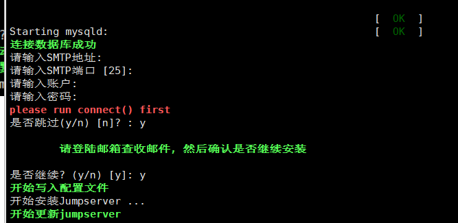 地址端口账户密码直接回车 ,询问跳过输入y,是否继续输入y