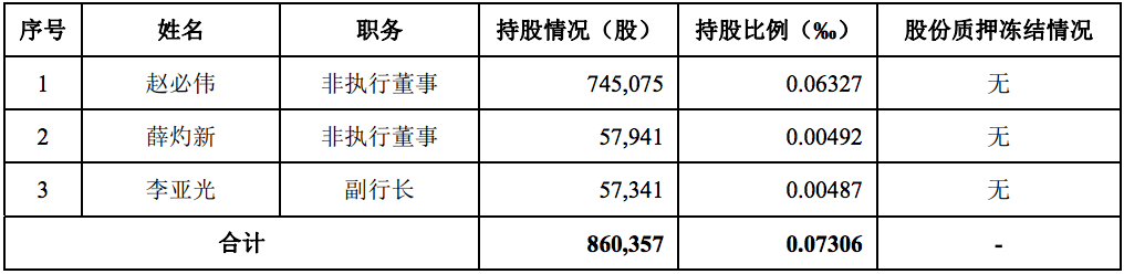 贝多财经发现,广州银行的高管中,仅有副行长李亚光、非执行董事薛灼新和赵必伟持有该行股份。其中,赵必伟持股745,075股,薛灼新持股57,941股,李亚光持股57,341股,合计占比为0.07306%。