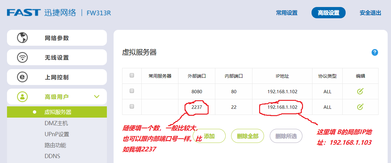 常用服务器不用填,内部端口填22(ssh御用端口),外部端口可与内部端口一样,也可以填个大点的数以防止与现有的端口重复,比如我填2237,IP地址填B的局部IP:192.168.1.103(忽略我图上填的);协议类型选all(有的路由是选both,反正就是支持所有协议的意思)。最后保存。此操作的意思就是让外网通过端口2237给路由器传输命令,让路由器知道我要转发局部IP为192.168.1.103的ssh服务(为什么是ssh服务?因为内部端口22代表ssh服务)。