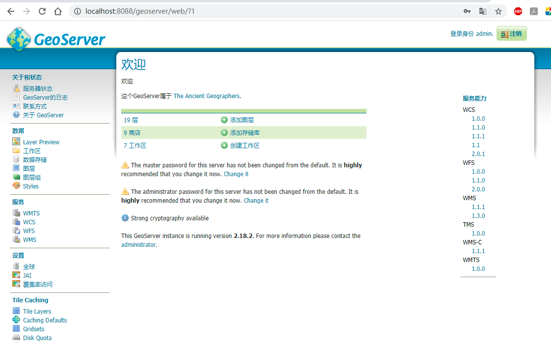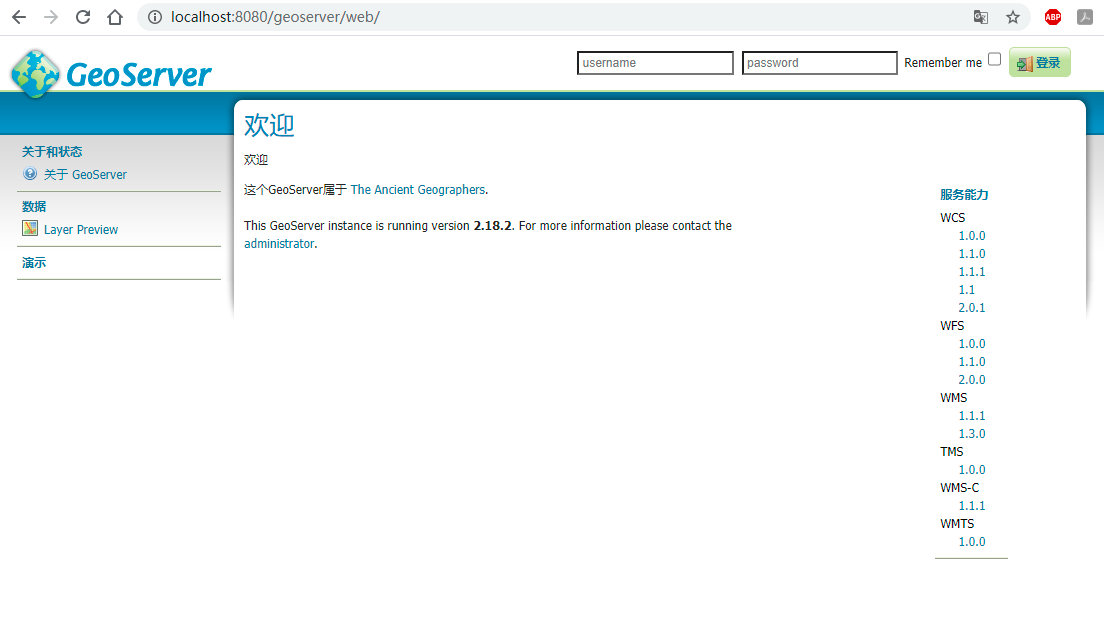 默认安装后,用户名为“admin”,密码为“ geoserver ”,登陆后页面如下: