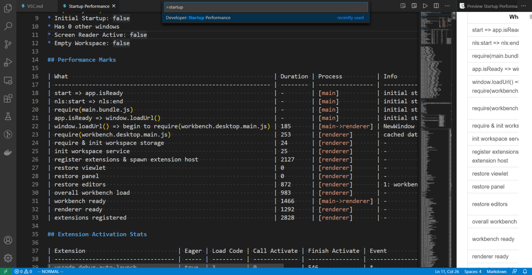 Ctrl + Shift + P输入Startup Perfromance进行查看。