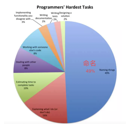 在编程工作中,命名是一件让很多开发者都头疼的事情。国外曾经有个一次关于程序员最难任务的投票调查,结果命名占了 49%。