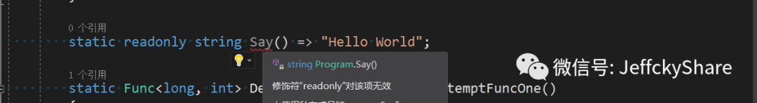 我相信你写过的绝大多数方法都无法使用readonly修饰符(编译报错),所以有面试官问了很偏门的问题,方法支持使用readonly修饰符吗?看过本文后,应毫不犹豫的回答:支持