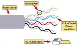 双绞线:由两根具有绝缘层的铜导线按一定密度,逆时针方向绞合而成。