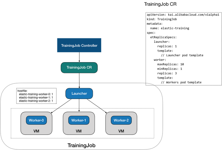 TrainingJob CR 的配置分为 Lanucher 和 Worker。在 Launcher 中指定任务的镜像和启动执行, 默认 et-operator 会根据 worker 分配情况,生成一个 hostfile 文件和 discover_host 脚本,discover_host 脚本挂载到 Launcher 的 /etc/edl/discover_hosts.sh 文件, 在入口脚本的 horovodrun 执行中通过 --host-discovery-script 参数指定。在 Worker 设置中指定 worker 的镜像和 GPU 占用 ,并可以通过 maxReplicas / minReplicas 指定 workers 的副本数允许范围。