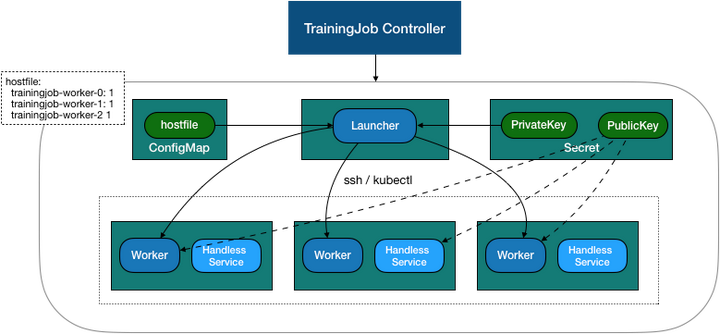 - 创建 launcher,挂载 configmap。由于 hostfile 后续会随着拓扑关系修改,所以 hostfile 单独通过 initcontainer 从 configmap 拷贝到单独目录。
