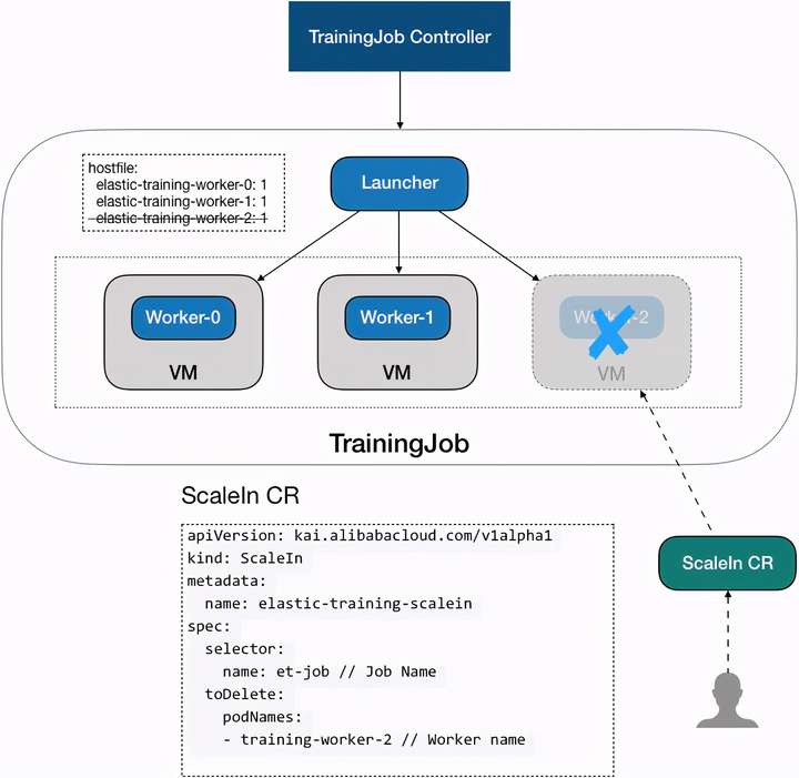 执行缩容时,可以通过 ScaleIn CR 中的 spec.toDelete.count 或 spec.toDelete.podNames 字段指定缩容的 worker。