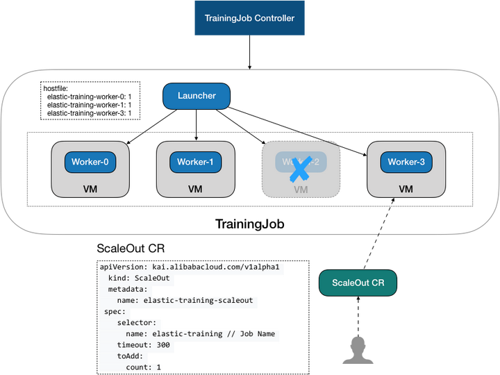 除了 TrainingJob 外,et-operator 同时支持 ScaleOut 和 ScaleIn 两种 CRD,下发训练任务扩容和缩容操作。