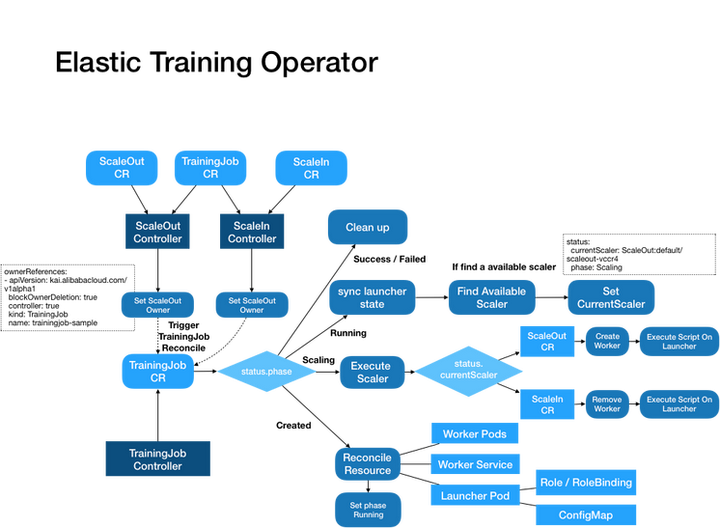TrainingJobController 中监听到属于 TrainingJob 的 ScaleOut CR 有更新, 触发 TrainingJob 的 Reconcile,遍历过滤 TrainingJob 下 OwnerReference 指向的 ScaleIn 和 ScaleOut, 根据创建时间和状态时间决定执行的扩容或者缩容。