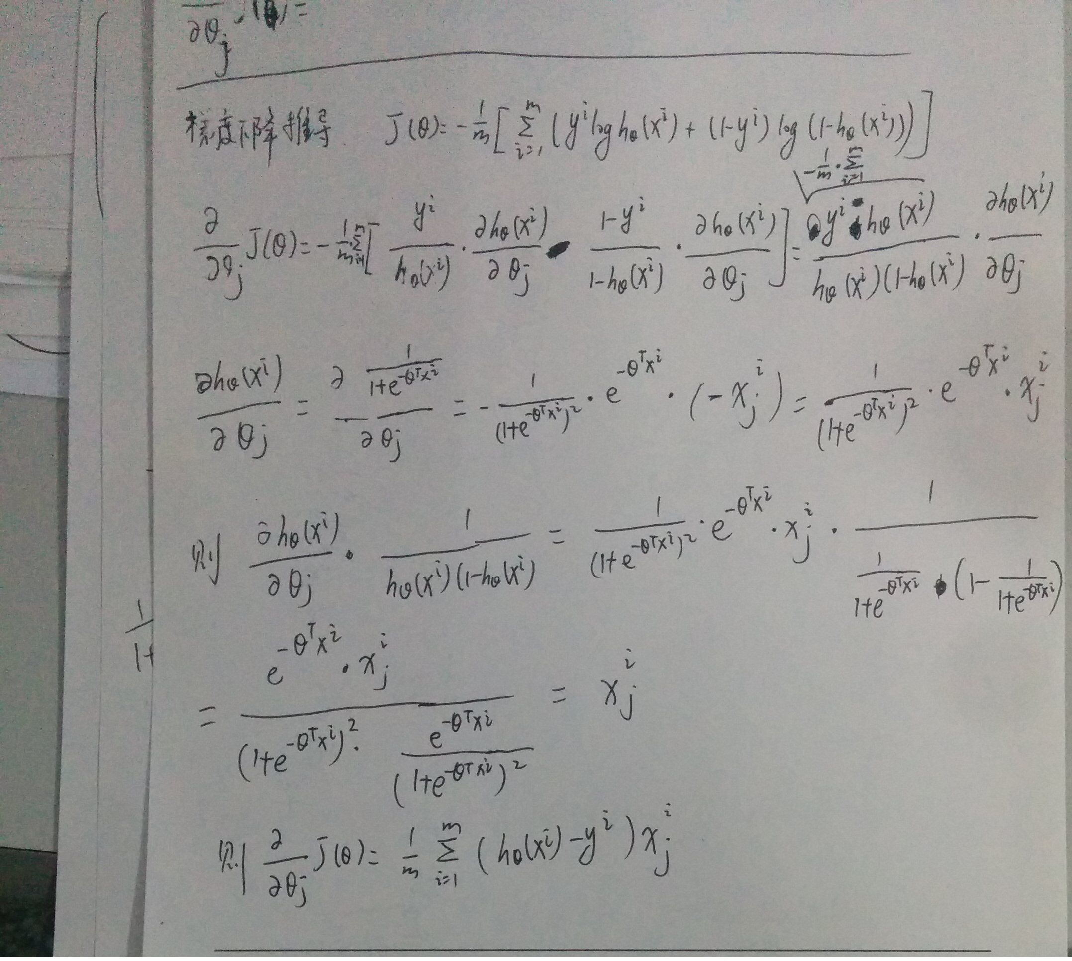 介绍 logistic regression是一种最基本的分类算法。它的模型为 ,其中 。 其代价函数 。 对于二分类问题,y的取值为0和1,这里,我们设定 为y=1概率。当其大于等于0.5时,我们预测结果为1,当其小于0.5时,我们预测结果为0。 使用梯度下降算法 迭代公式: 其中 。推导过程见下图。 矢量化表达: 。 来源:oschina链接:https://my.oschina.net/u/4279696/blog/3979639 标签 regression 梯度下降