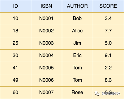 我们还是以书籍检索为例,假设有以下数据,每一行就是一个 Document,每个 Document 由 id,ISBN 号,作者名称和评分组成。