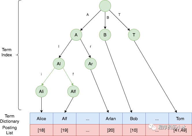 综上, Alice,Alf,Arlan,Bob,Tom 等词的倒排索引如下所示。绿色部分是 Term Index,蓝色部分是 Term Dictionary,红色部分是 Posting List。