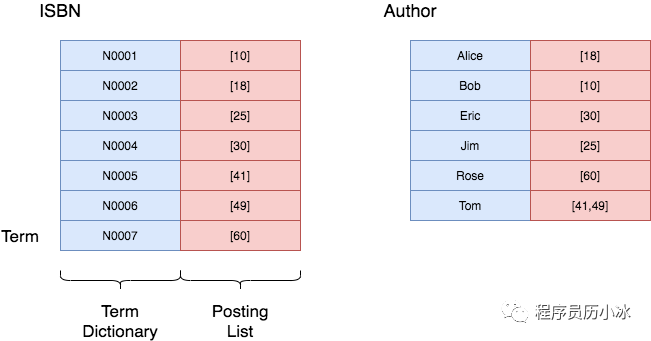给上述数据按照 ISBN 和 Author 建立的倒排索引如下所示。倒排索引是每个字段分开建立的,相互独立。有两个专门的术语,分别是索引 Term 和倒排表 Posting List。字段的值就是 Term,比如 N0007,而 Term 对应的文档 ID 的列表就是 Posting List,对应图中红色的部分。