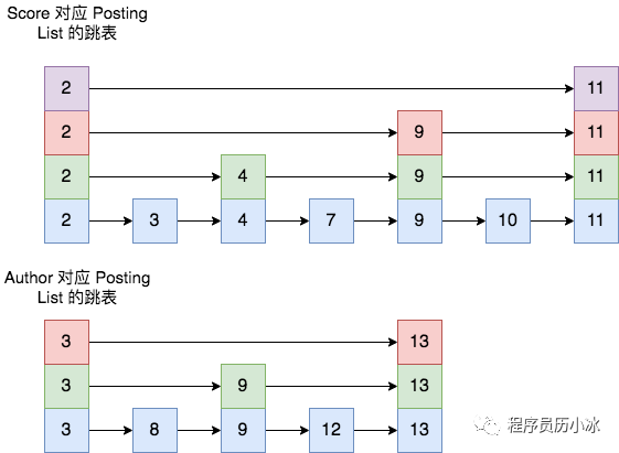 比如,按照 Score 查出来的 Posting List 为[2,3,4,5,7,9,10,11],按照 Author 查出来的结果为 [3,8,9,12,13],则二者的跳表结构如下图所示。