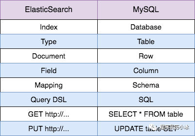 下面,我们来介绍一下 ElasticSearch 的相关概念。为了便于初学者理解,我们先将 ElasticSearch 中的概念和 MySQL 中的概念大致地进行对应。但是二者在具体细节上还是有很多差异的,大家深入了解 ElasticSearch 就会将二者区分清楚,不能强行对比等同。