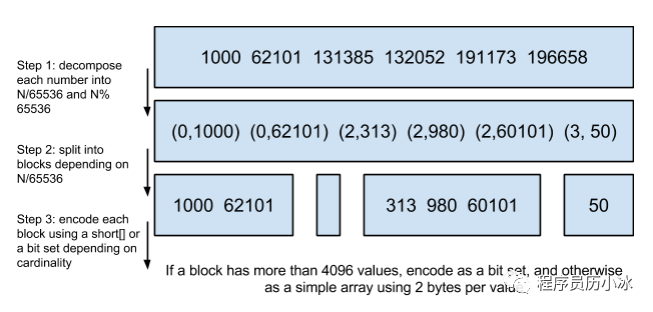 而 RoaringBitmap 就是为了解决稀疏存储的问题。下图就是 RoaringBitmap 的基本原理示意图。