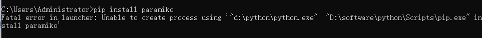 3.执行pip install paramiko,出现Fatal error in launcher: Unable to create process using '"d:\python\python.exe" "D:\software\python\Scripts\pip.exe" install paramiko'