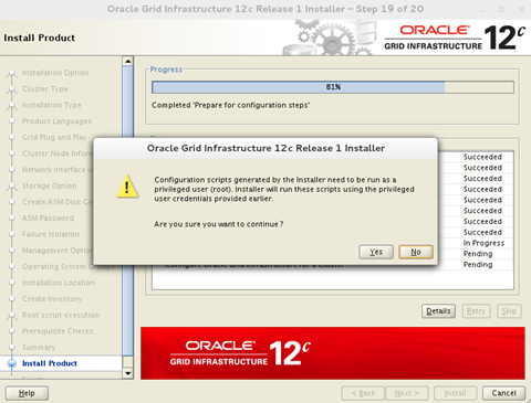 在安装过程中,将提示您以root身份在两个节点上执行root.sh。当提示时,逐个在两个节点上执行,单击确定关闭该框,以便进一步安装。