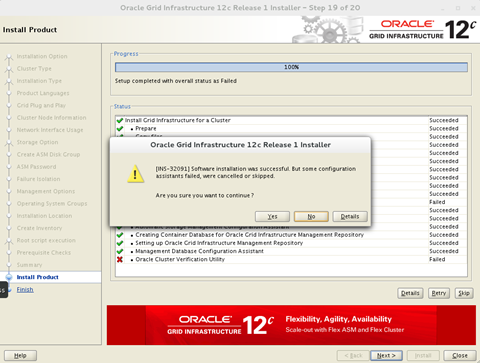 安装完成。我在这里看到一个错误,那是因为post安装步骤中执行失败。cluvfy 失败的原因与上面的步骤上面所解释的一样,所以我点击了确定关闭该框。