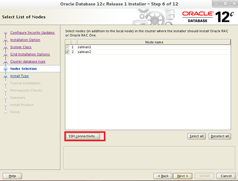 默认情况下,选择所有节点进行数据库软件安装,单击"SSH Connectivity"按钮,以前在 grid 基础架构安装期间配置了 grid 用户,需要配置SSH连接。这次SSH将被配置为"oracle"用户。配置完成后,单击下一步