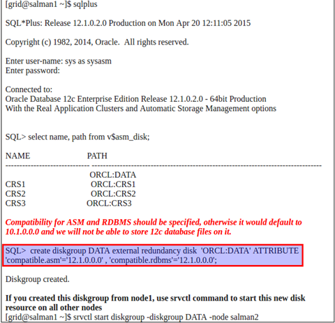 SQL> create diskgroup DATA external redundancy disk 'ORCL:DATA' ATTRIBUTE 'compatible.asm'='12.1.0.0.0' , 'compatible.rdbms'='12.1.0.0.0';