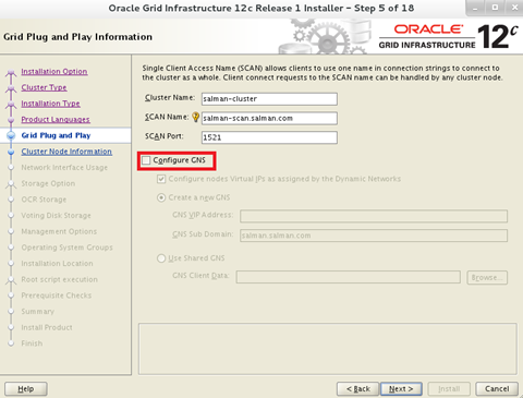 如果需要,更改集群名称和SCAN名称和SCAN端口。确保SCAN名称与/ etc / host文件中指定的相同。取消选中"Configure GNS"。点击下一步