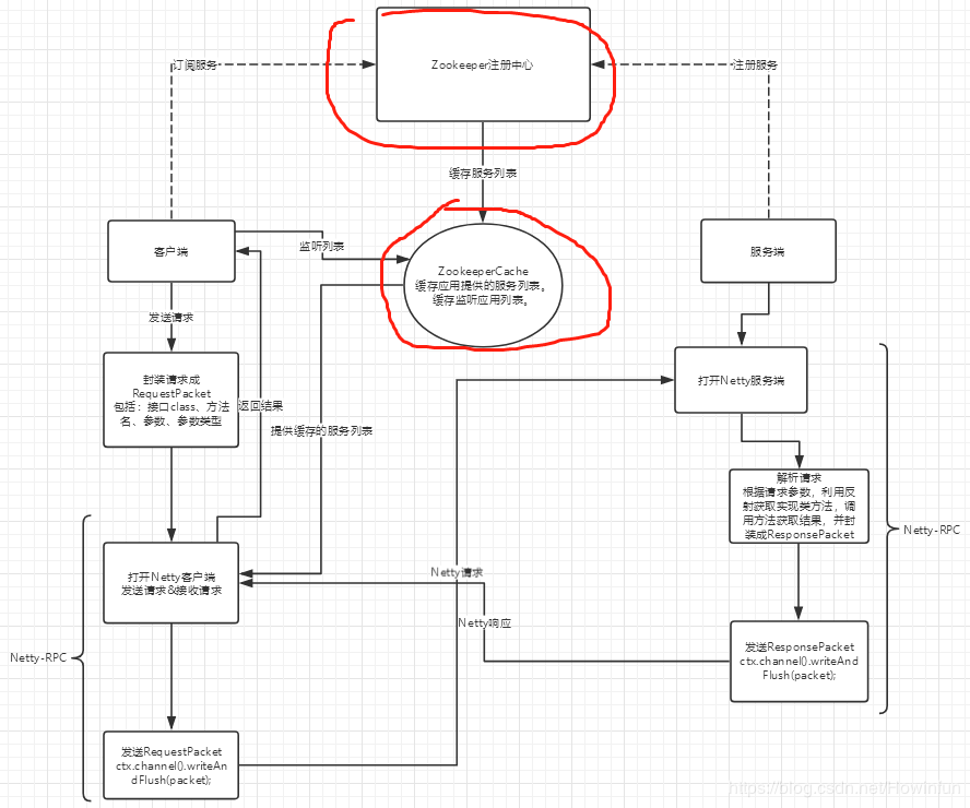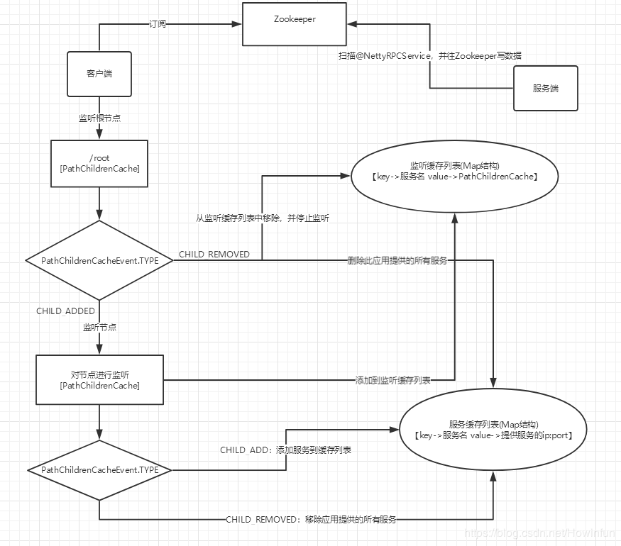 首先是服务端:在zookeeper的/root下创建名为配置文件中namespace(例如rpc-server)的节点,然后我们可在上面的扫描带@NettyRPCService实现类缓存起来的同时,每一个实现类就往/root/namespace下创建一个节点,节点名为@NettyRPCService的value().getName+version(),节点内容为IPPojo(ip+提供netty服务端口号)的Json字符串。 再来客户端:客户端主要是要做监听,首先是监听(使用PathChildrenCache,可监听子节点的增删改)根节点/root,如果有节点新增,则表明有新应用提供服务:这时候我们又要继续对此节点做监听(也是使用PathChildrenCache),并且将PathChildrenCache缓存到内存缓存中【监听缓存列表】。如果有节点删除,则表明有应用不提供服务了:这时候我们将监听关闭掉,并且从【监听缓存列表】中删除,并且从【服务缓存列表】删除应用提供的所有服务。根节点/root下面的子节点才是真正提供的RPC服务:当新增,需要将节点信息缓存到内存缓存中【服务缓存列表】;当删除,从【服务缓存列表】中删除对应数据。