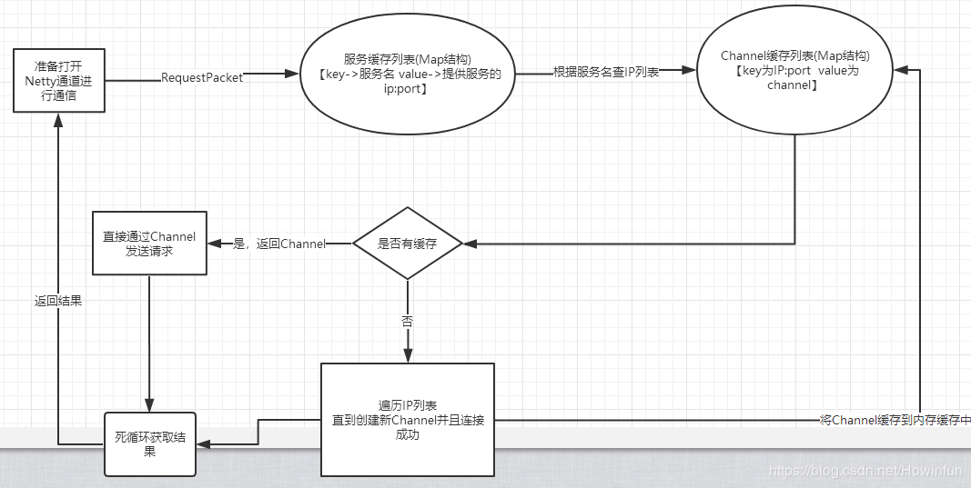 在没有注册中心时,服务端的IP和PORT是写在配置文件里的,我们直接获取IP信息,并且判断在【Channel缓存列表】是否有此IP对应缓存起来的的Channel,有则获取直接进行RPC通信,否则创建新Channel进行RPC通信,记得还要缓存起来。 而在有注册中心时,我们需要在请求Packet中获取需要提供的服务名,然后根据服务名在【服务缓存列表】获取所有提供此服务的所有应用IP,然后就是判断IP列表在【Channel缓存列表】中是否有缓存的Channel,有则获取并直接进行RPC通信; 否则,遍历应用IP列表,直到创建新Channel通信并且连接成功,然后将Channel缓存起来。最后,进行RPC通信然后等待获取Result即可。