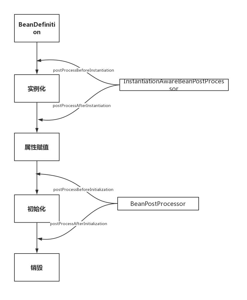 这两兄弟可能是Spring扩展中最重要的两个接口!InstantiationAwareBeanPostProcessor作用于实例化阶段的前后,BeanPostProcessor作用于初始化阶段的前后。正好和第一、第三个生命周期阶段对应。通过图能更好理解: