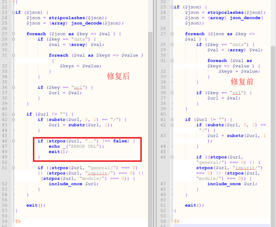 未修复前,可通过精心构造json进入47行的includ_once进行文件包含。官方在补丁中增加了对".."的过滤防止用户读取其他目录文件。