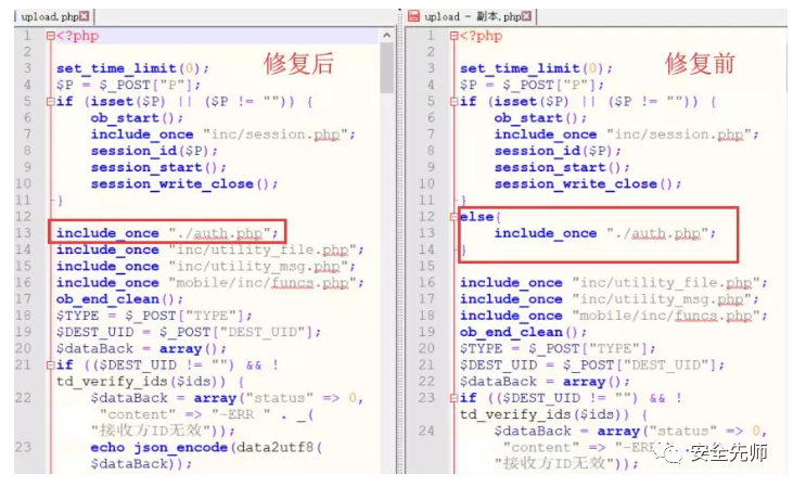 要上传首先需要绕过登陆验证,在本系统中auth.php是登陆验证的相关逻辑,但在upload.php未修复前,如果$P非空就不需要经过auth.php验证即可执行后续代码。利用此处逻辑漏洞可绕过登陆验证直接上传文件。