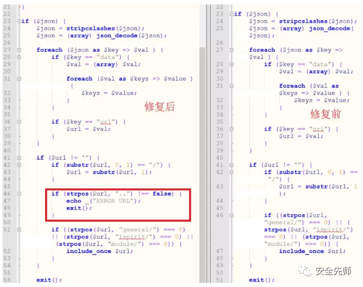 与上传相反,这里不传P参数就可以文件包含。未修复前,可通过精心构造json进入47行的includ_once进行文件包含。官方在补丁中过滤了 ,防止用户读取其他目录文件。