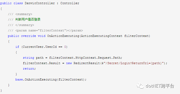 当用户登录成功后,会将当前的用户信息赋值给一个静态类(使用Session进行存储),对于判断用户是否登录,则是通过自定义一个控制器的基类,重写OnActionExecuting方法来实现对于用户是否登录的判断,实现代码如下。