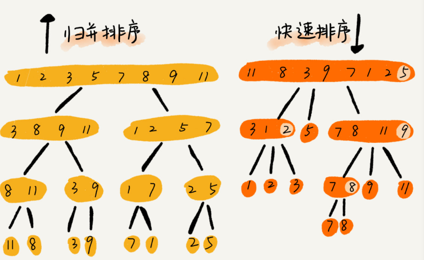 排序数组,将数组从中间分成前后两部分,对前后两部分分别排序,然后合在一起,这个数组就是有序的。