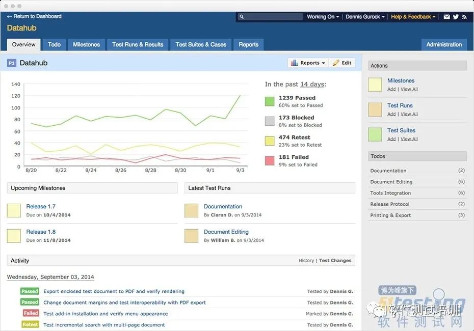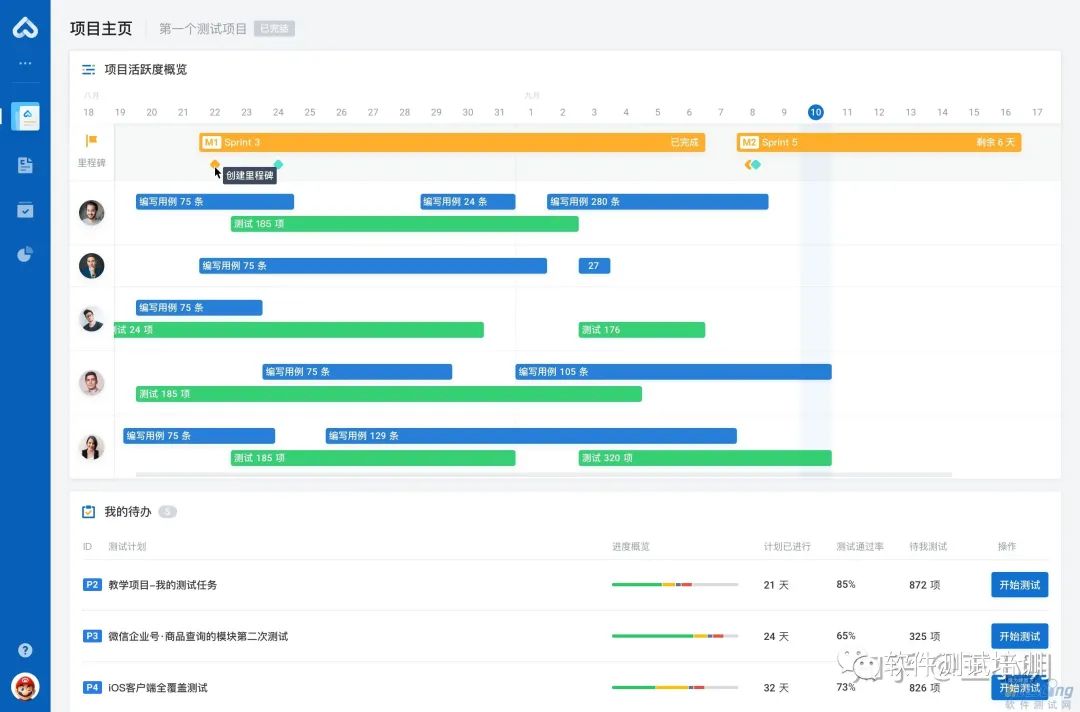 实时绘制项目进度甘特图;实时协同,测试工作在一个实时界面中,自动更新状态,协同效率高;里程碑概念符合现代敏捷开发趋势;支持集成第三方缺陷工具(Jira、Readmine、Trello等);交互设计很亮眼,操作效率极高,非常值得推荐。