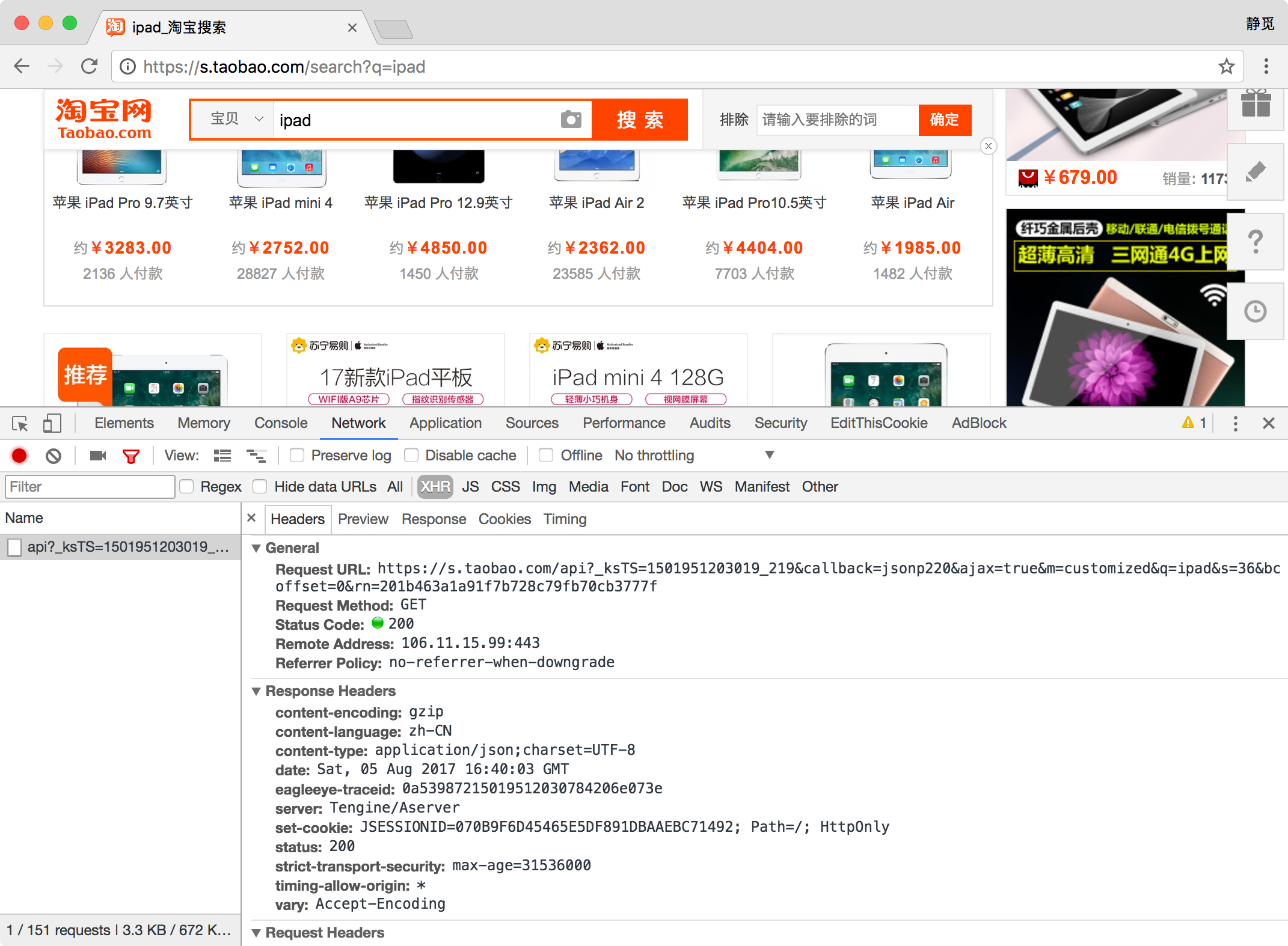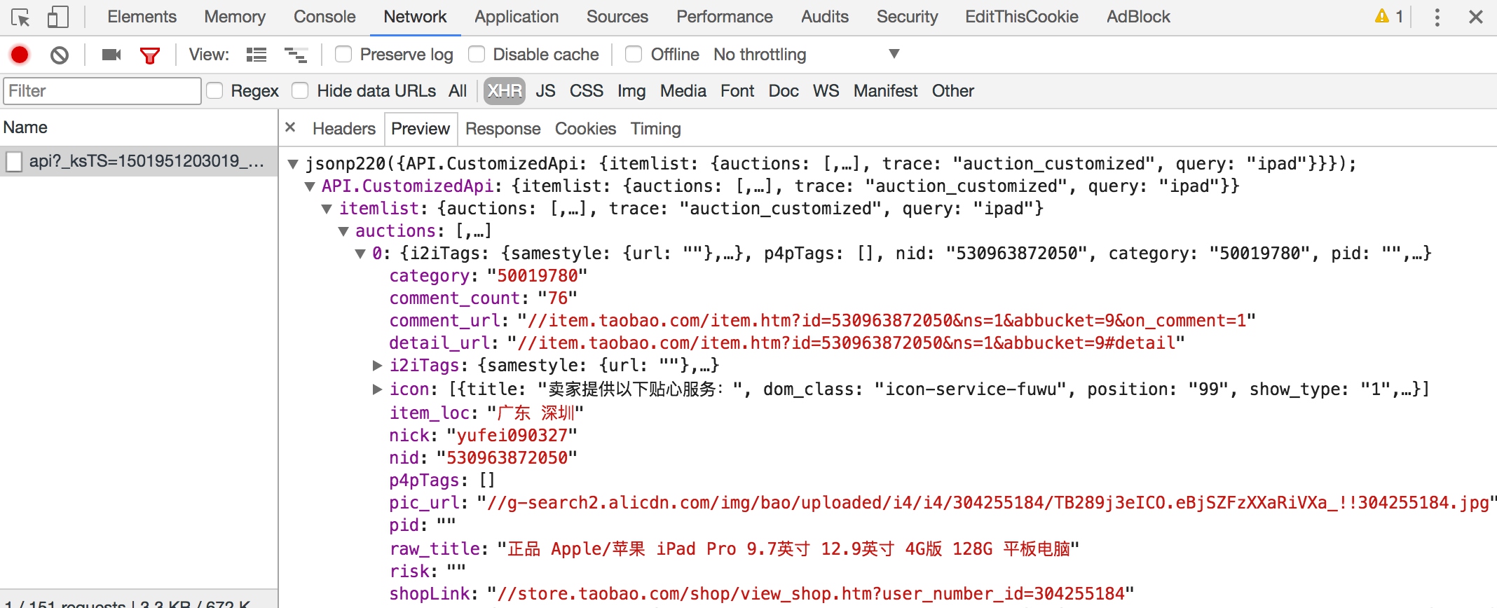 首先,我们来看下淘宝的接口,看看它比一般Ajax多了怎样的内容。