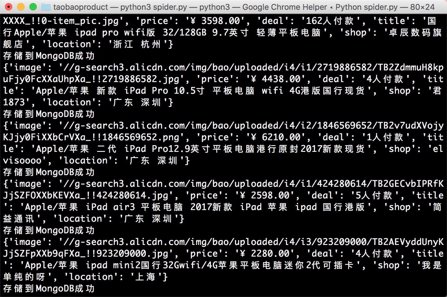 这里首先创建了一个MongoDB的连接对象,然后指定了数据库,随后指定了Collection的名称,接着直接调用insert()方法将数据插入到MongoDB。此处的result变量就是在get_products()方法里传来的product,包含单个商品的信息。