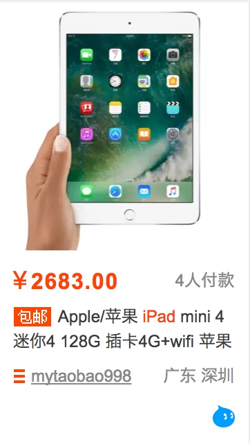 本节的目标是爬取商品信息。图7-21是一个商品条目,其中包含商品的基本信息,包括商品图片、名称、价格、购买人数、店铺名称和店铺所在地,我们要做的就是将这些信息都抓取下来。