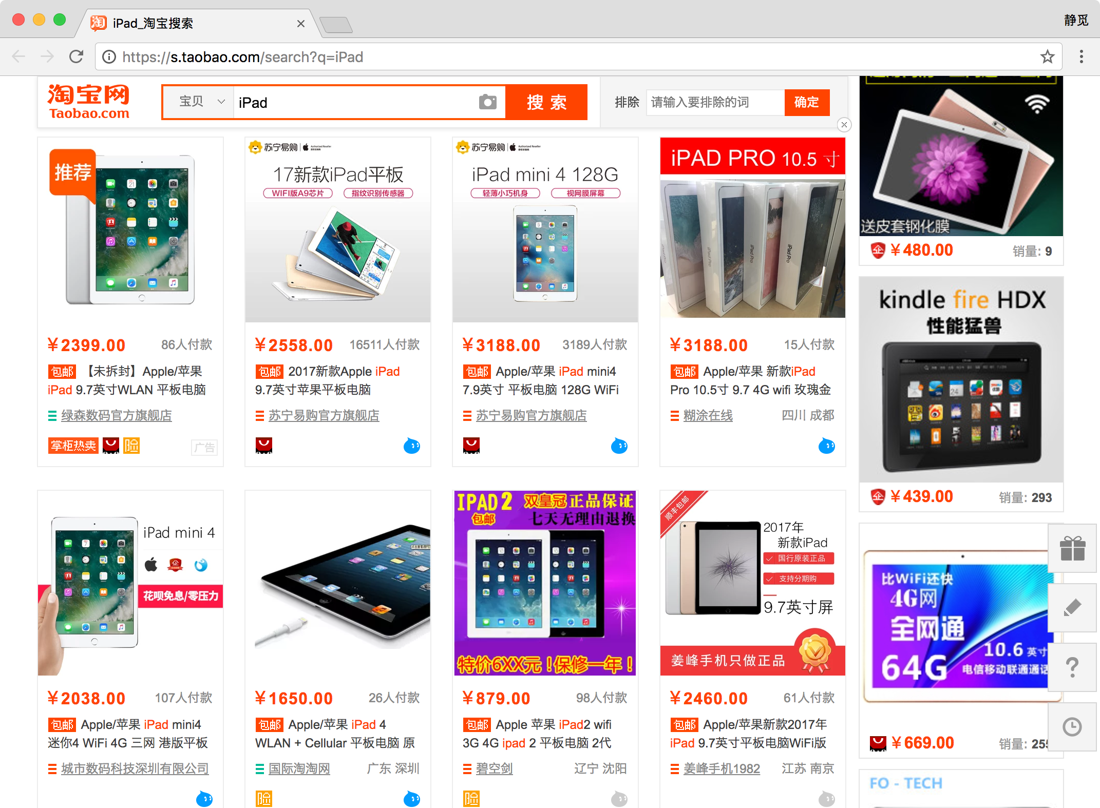 抓取入口就是淘宝的搜索页面,这个链接可以通过直接构造参数访问。例如,如果搜索iPad,就可以直接访问https://s.taobao.com/search?q=iPad,呈现的就是第一页的搜索结果,如图7-22所示。