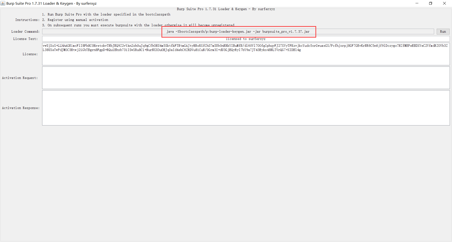 最后附上正常破解流程:首先打开如上图的burp-loader-keygen.jar文件,点击右侧的Run按钮成功拉起burpsuite,将burp-loader-keygen.jar里面的License复制到打开的待破解区域,如下图: