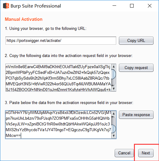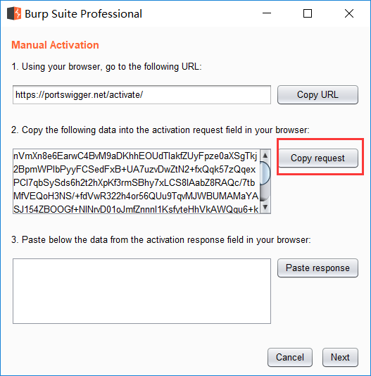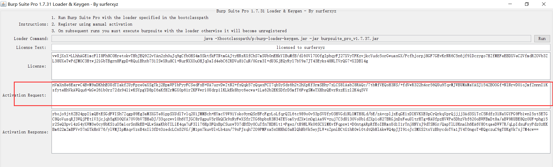 再点击Copy request按钮复制此数据,将此数据粘贴放入注册机的Activation Request后的区域,下方的Activation Response能即