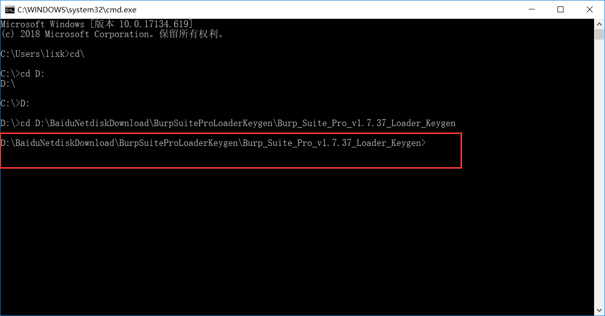 3.如果jar文件无法双击运行,那就只剩最后一个方法,即先使用java -jar 打开注册机,然后复制Loader Command里面的语句,先cd到burpsuite的文件目录,然后再运行复制下来的这段命令。cd命令如下(一定要先cd到解压目录,否则运行会提示找不到文件):