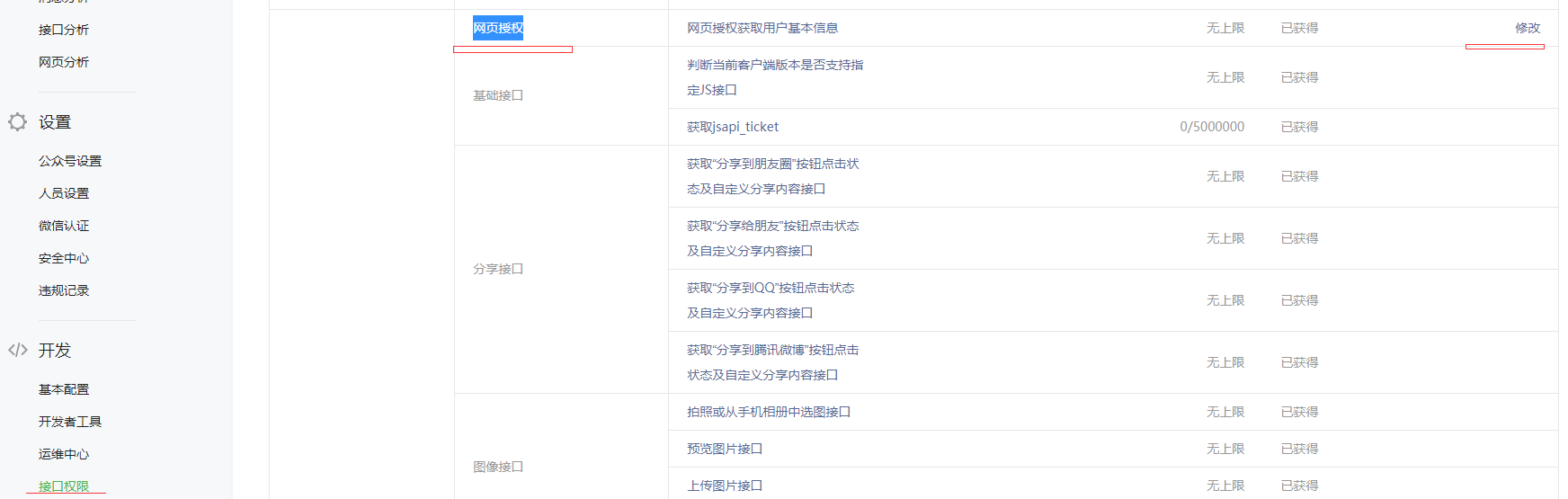 2.开发→接口权限→网页服务→网页授权→申请(已开通忽略)