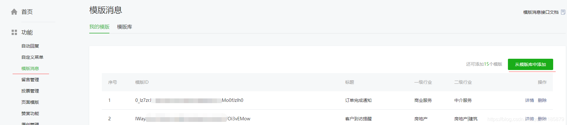 至此,微信公众号的模板消息设置完毕,省下的就是根据官网提供的api实现功能.