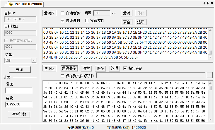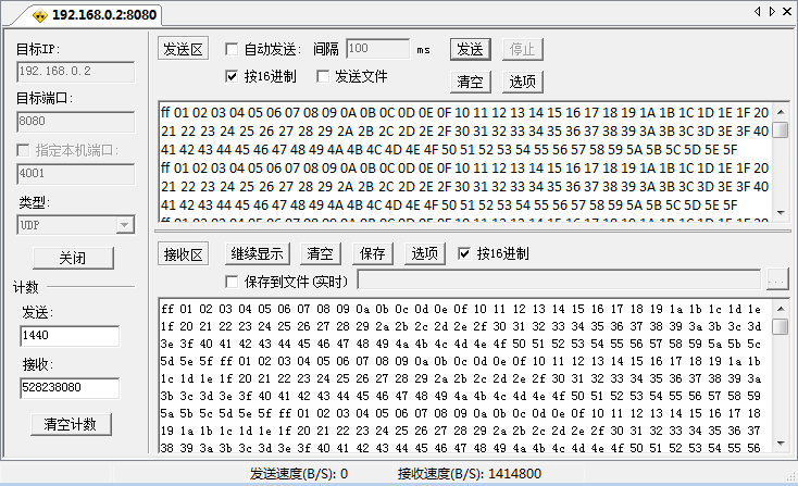 下面是TCP&UDP助手作为上位机测试结果,可见发送1440字节,其接收速度约1414800B/S,即1.135MB/S。显然,这个理论算的12M相差甚远,因此这个接收速度是错误的,没有参考价值。