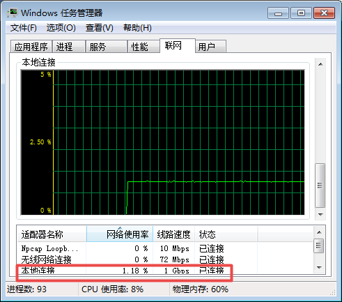 同时,看window管理器,网络使用率1.18%,即和理论计算的一致,约1.18MB/S。因此也可以看这个来确定网络传输速度。