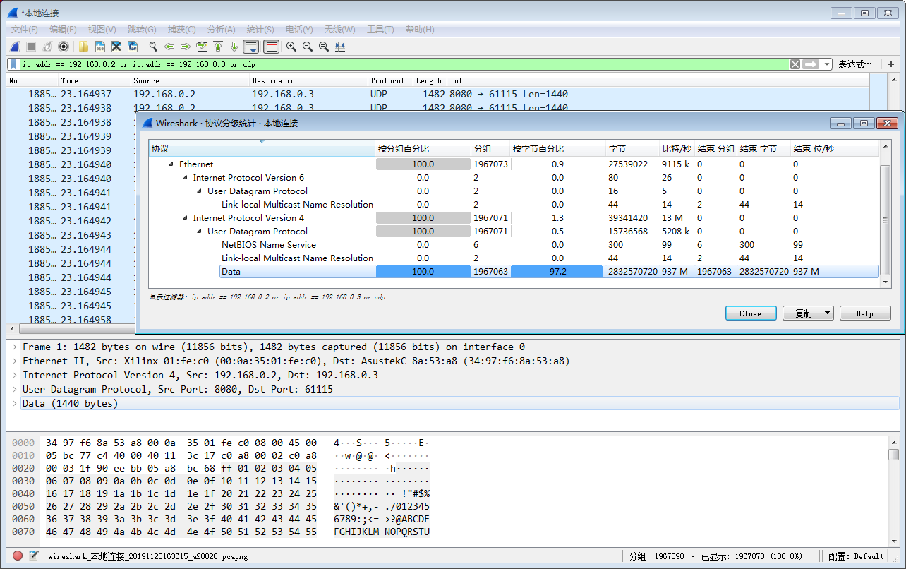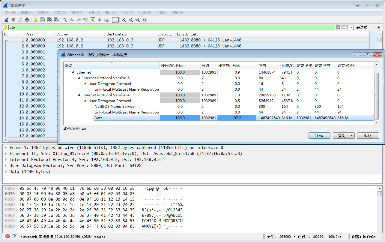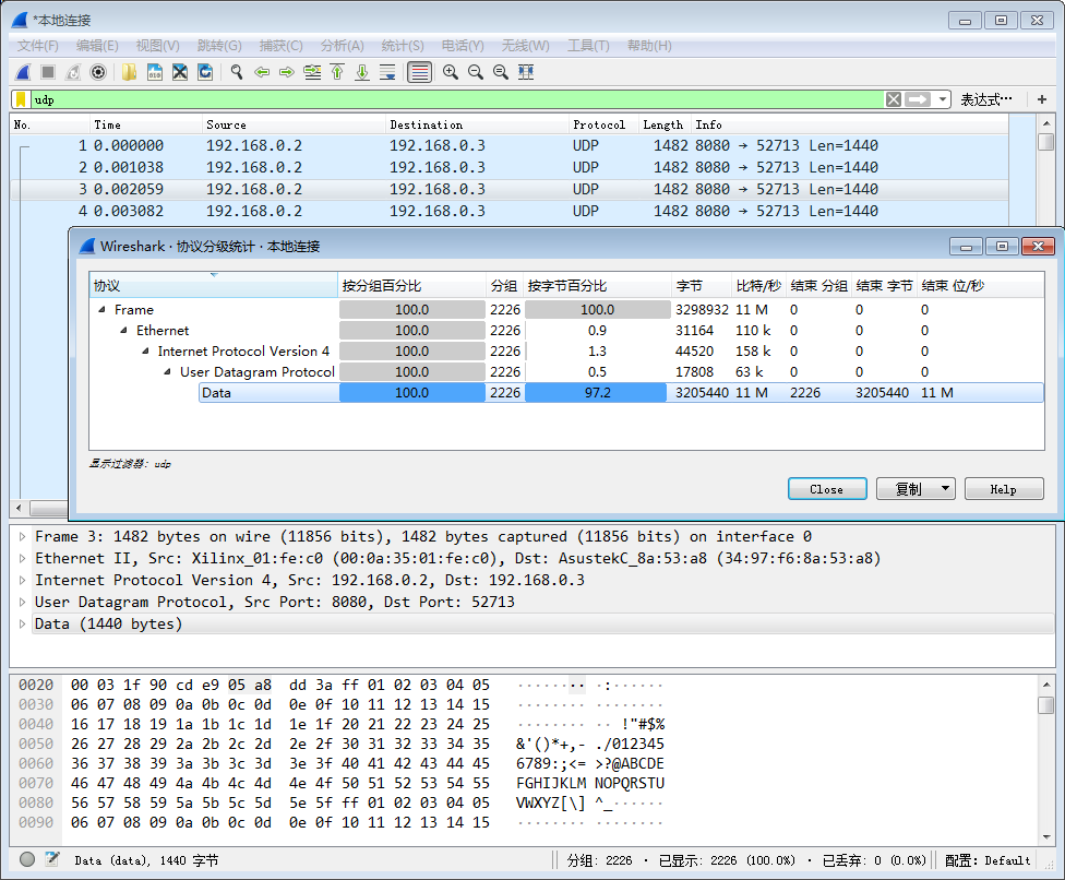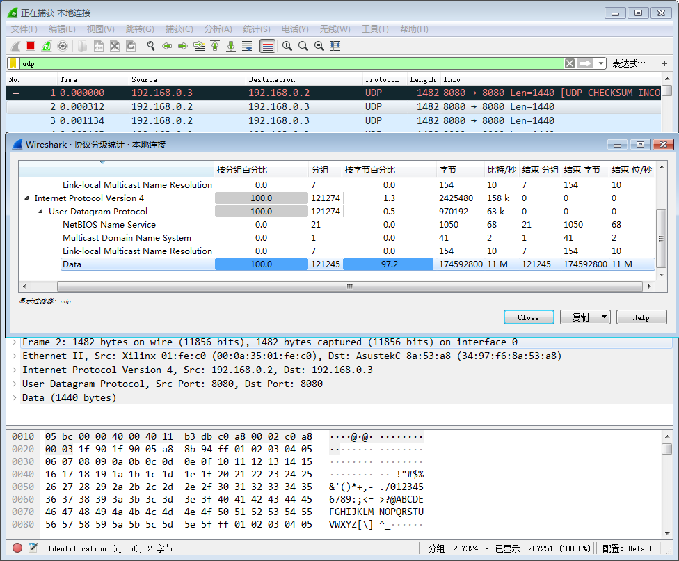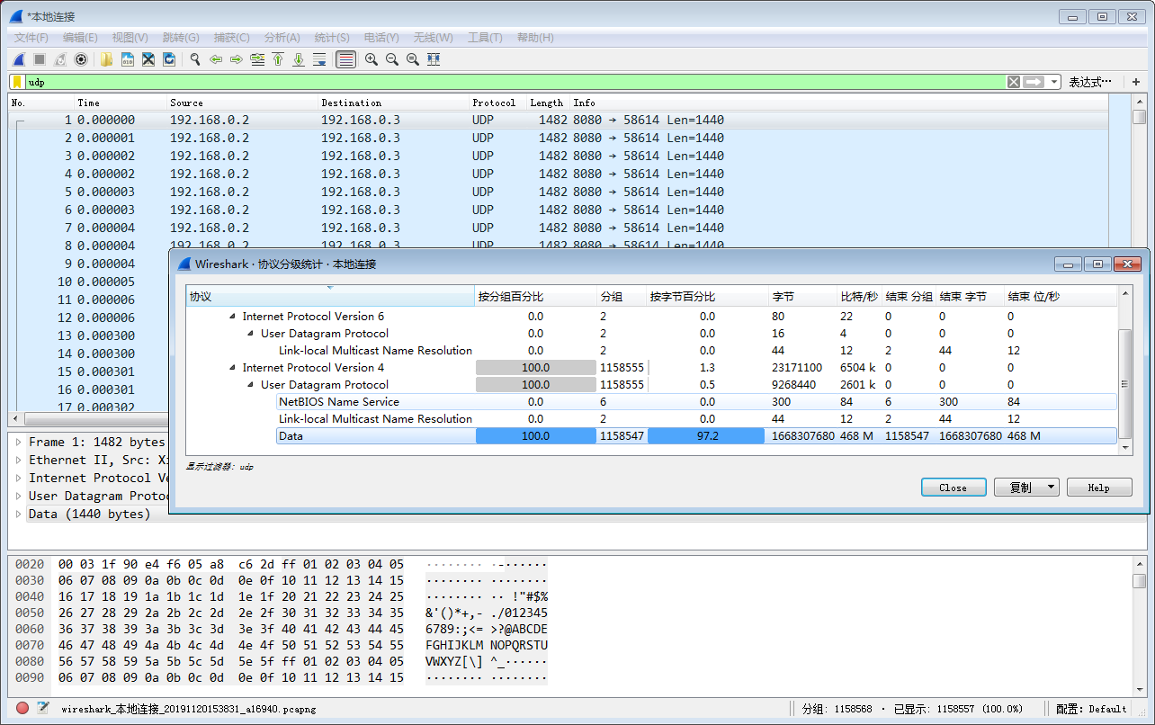 可见,通过WireShark的统计->协议分级能看到,正确的UDP发送速度为11MB/S。此为正确接收速度。但与千兆的速度相比,还差近100倍。所以,还有很大的提速空间。
