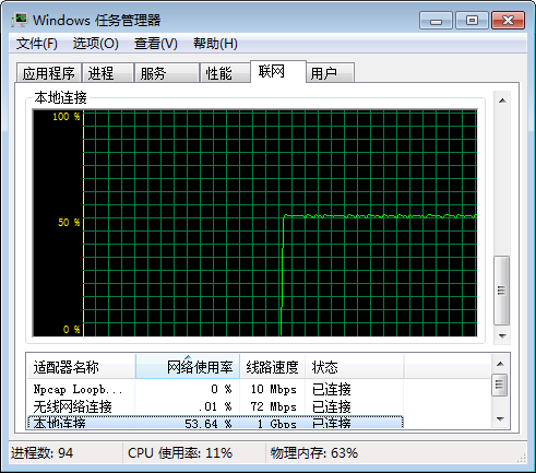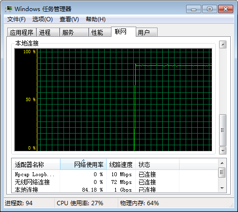 此时的管理器资源使用情况。如下使用了84.18,与WireShark抓取一致。